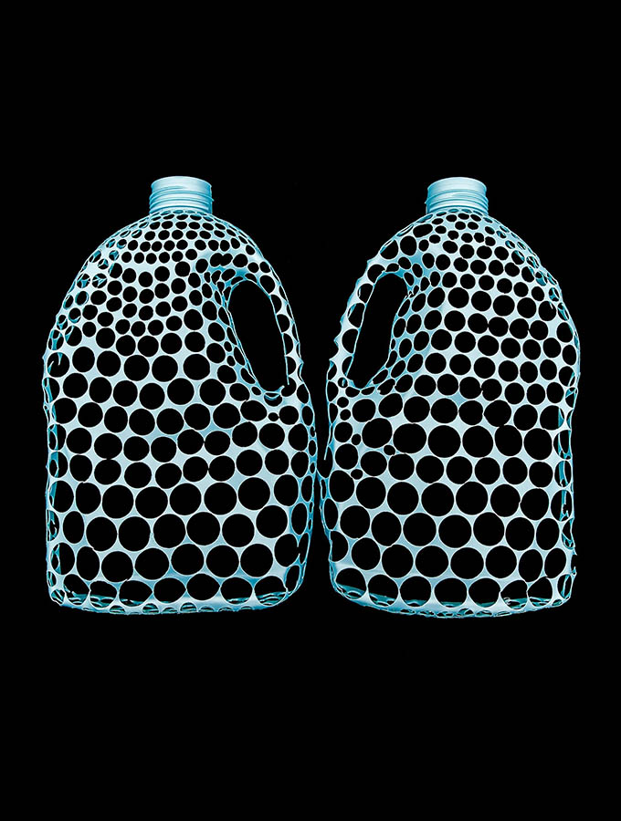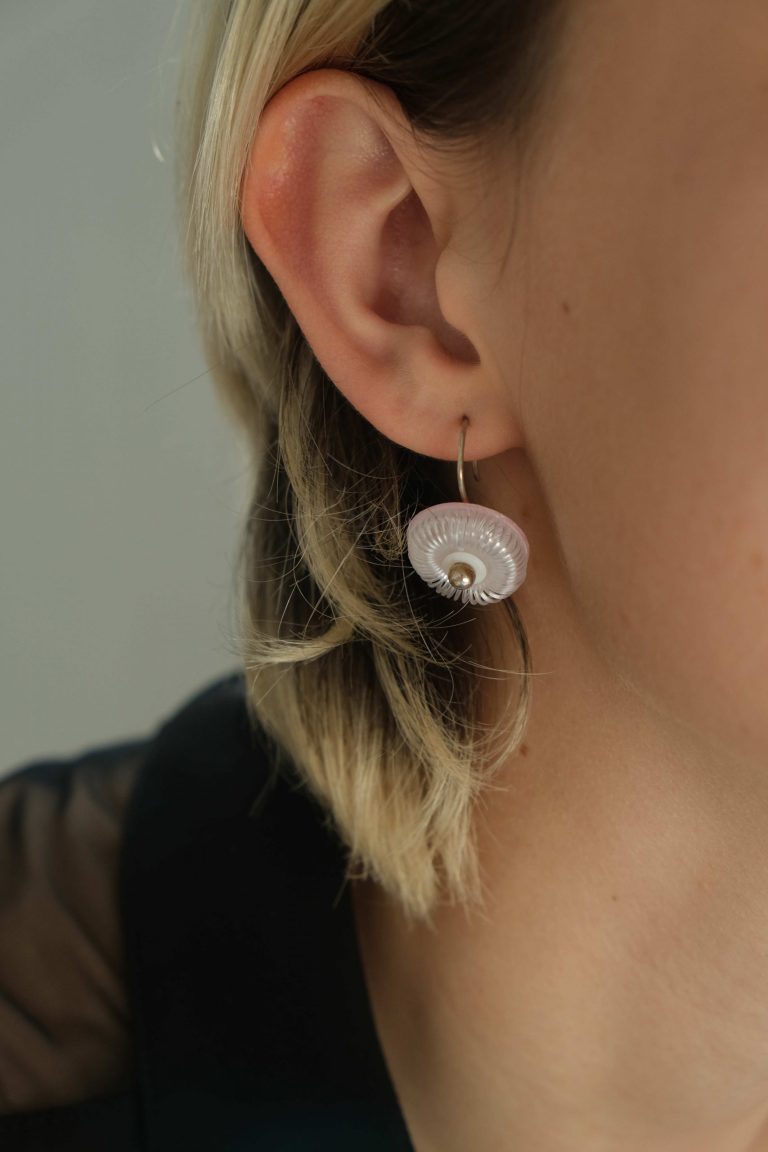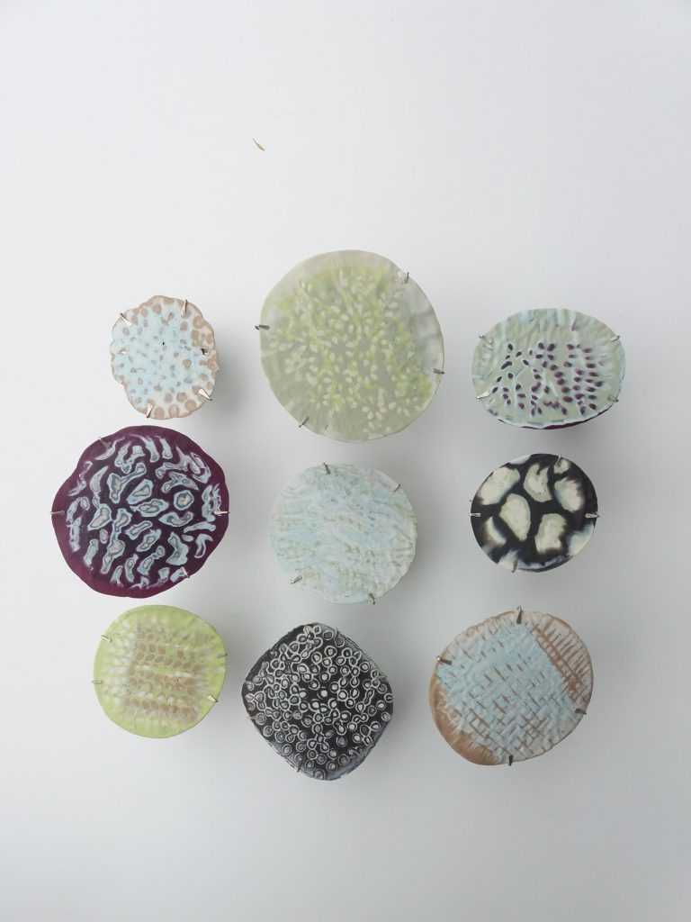Loet Gescher qui vit et travaille à Maastricht, transcende l’idée du plastique recyclé en créant des bijoux légers et colorés, parfois encore odorants. Elle explore la matière, se l’accapare et parvient à nous faire oublier son usage premier. Une broche se pose, un fil de soie constellé de pastilles danse au gré du mouvement, le collier se porte sans pesanteur avec beaucoup d’élégance.
