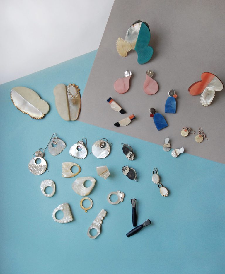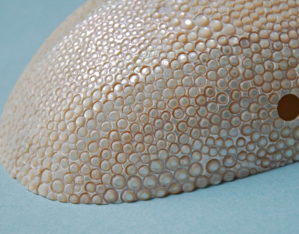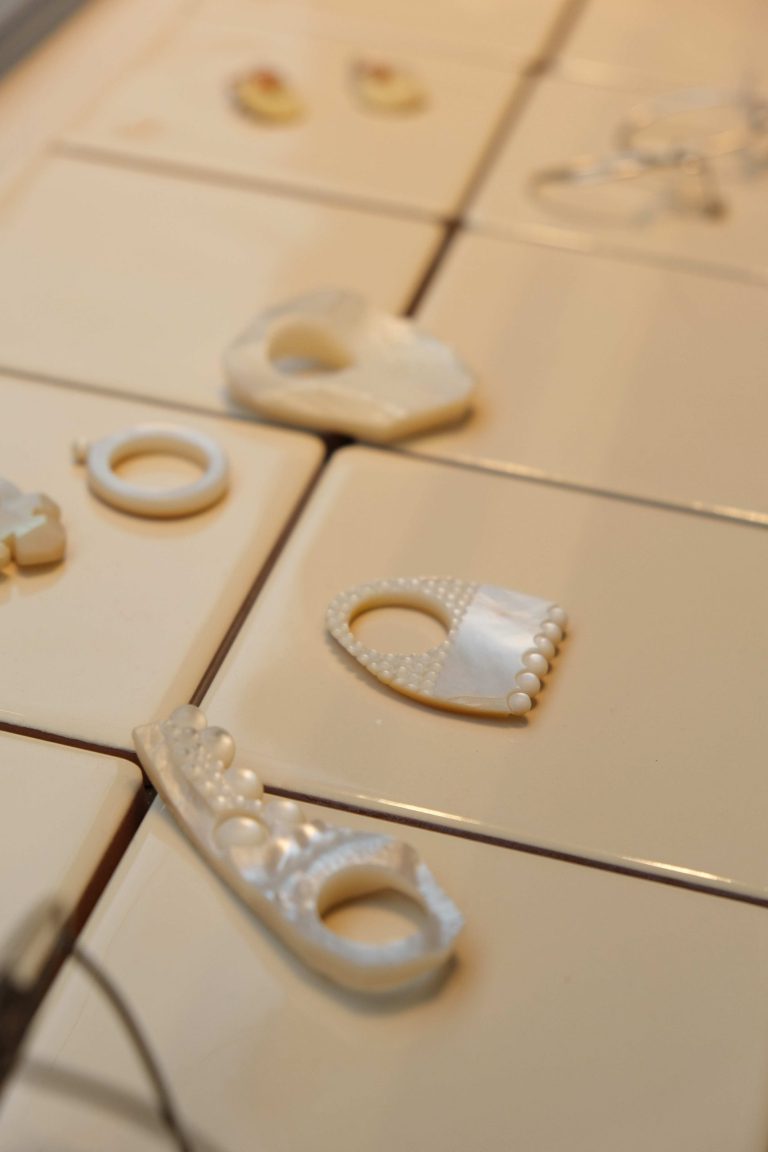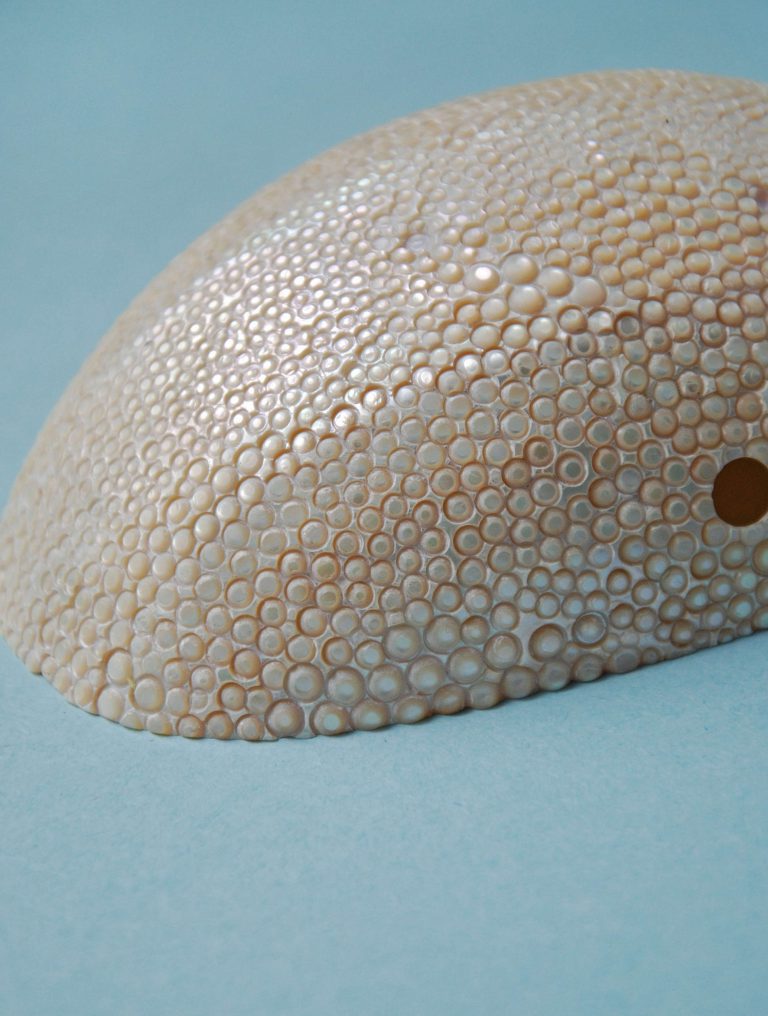 Danni Schwaag travaille directement la notion de toucher. La nacre est son élément de prédilection. Elle joue avec le chatoiement de celle-ci qu’elle oppose à l’inertie d’autres matières telle la galalithe.