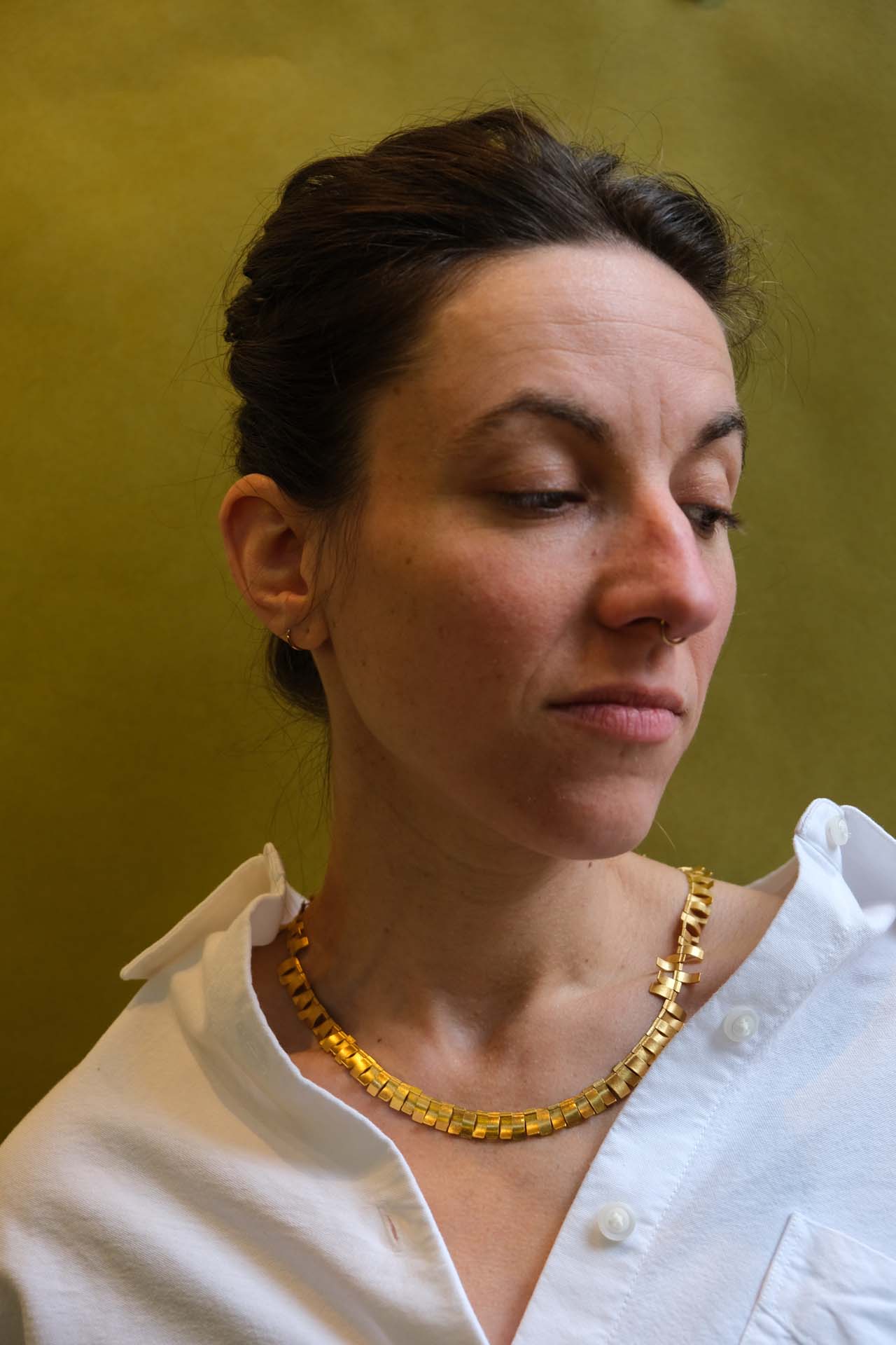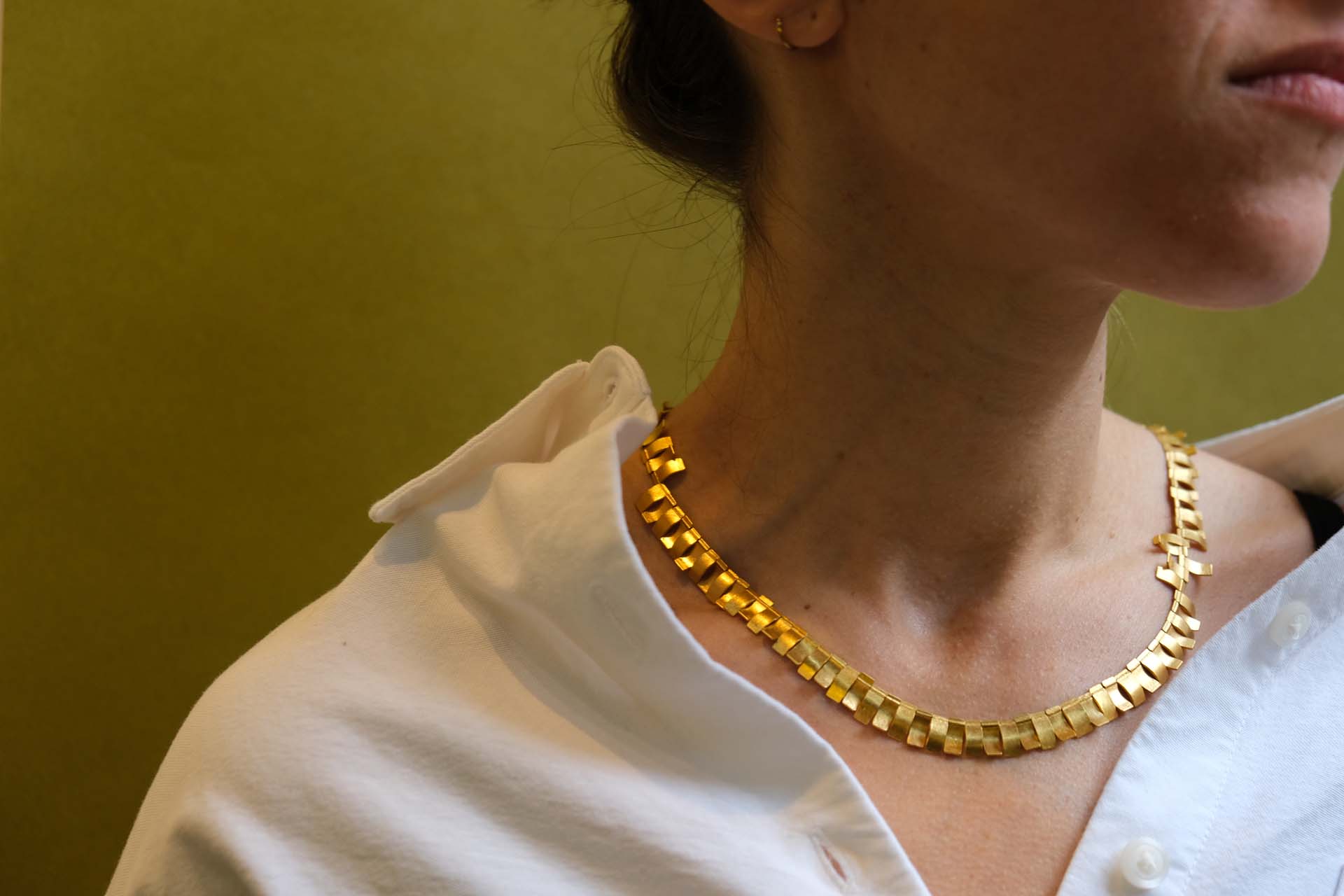 Vermeil bloemblaadjes geregen aan een stalen kabel dansen dicht langs het lichaam. Het metaal vangt het licht en geeft de ketting reliëf en sensualiteit.