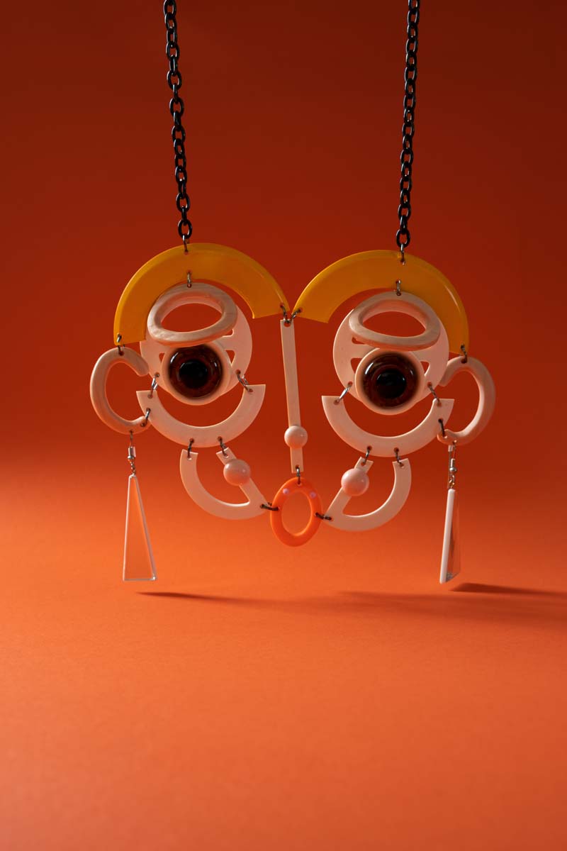 De sieraden van de kunstenaar zijn gemaakt van gevonden voorwerpen, die zijn uitgesneden en vervolgens opnieuw in elkaar gezet. Uit zijn handen ontstaan sculpturale objecten om te dragen, waarin humor een belangrijke rol speelt in zijn creativiteit.