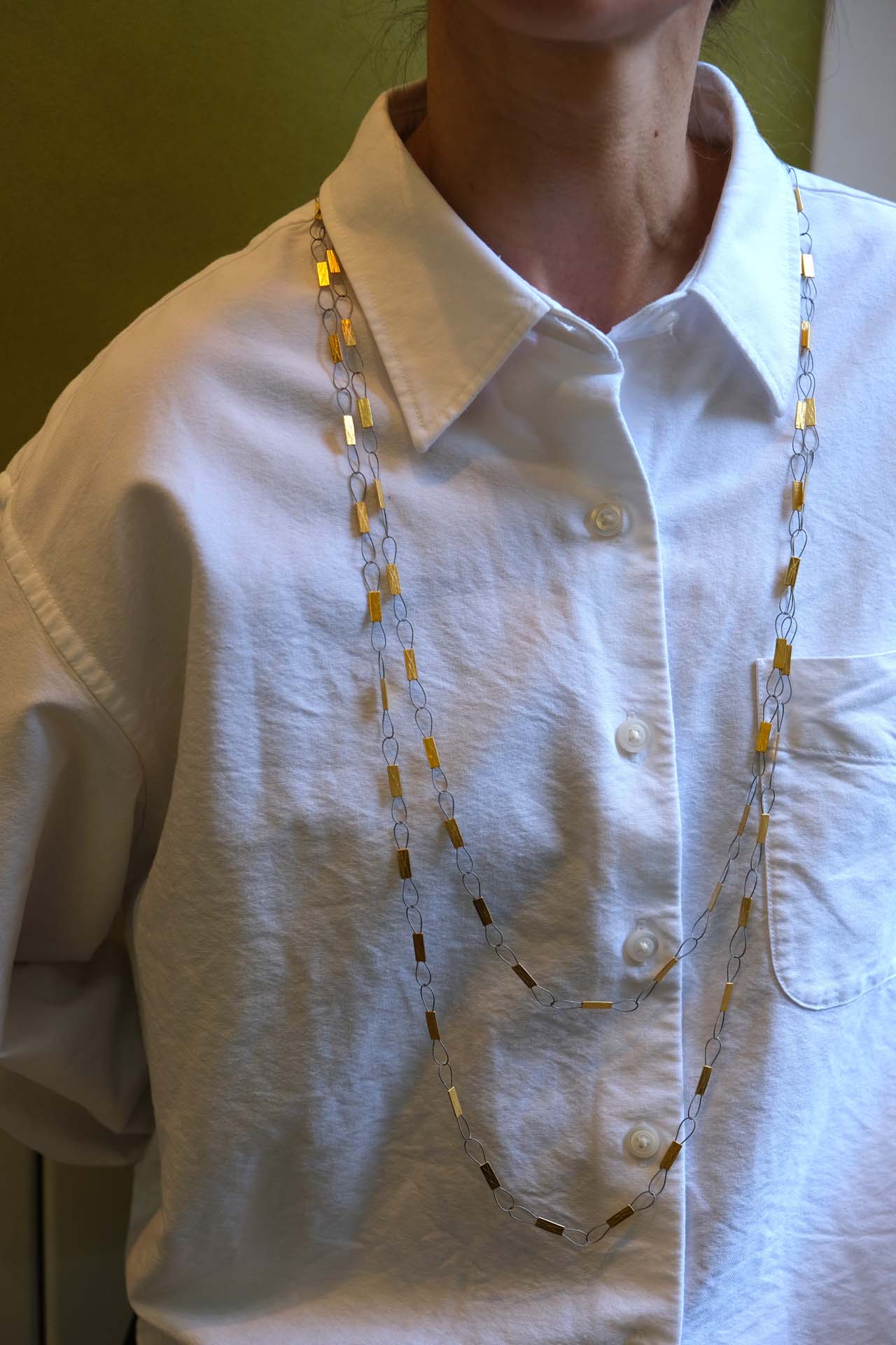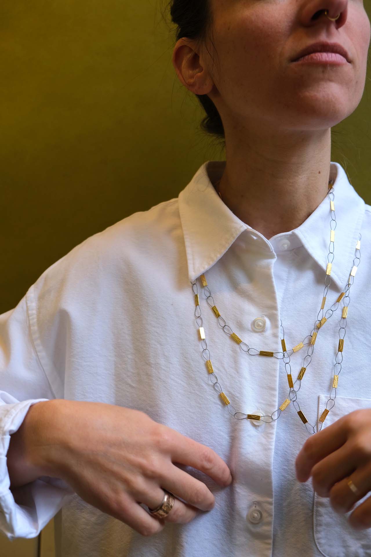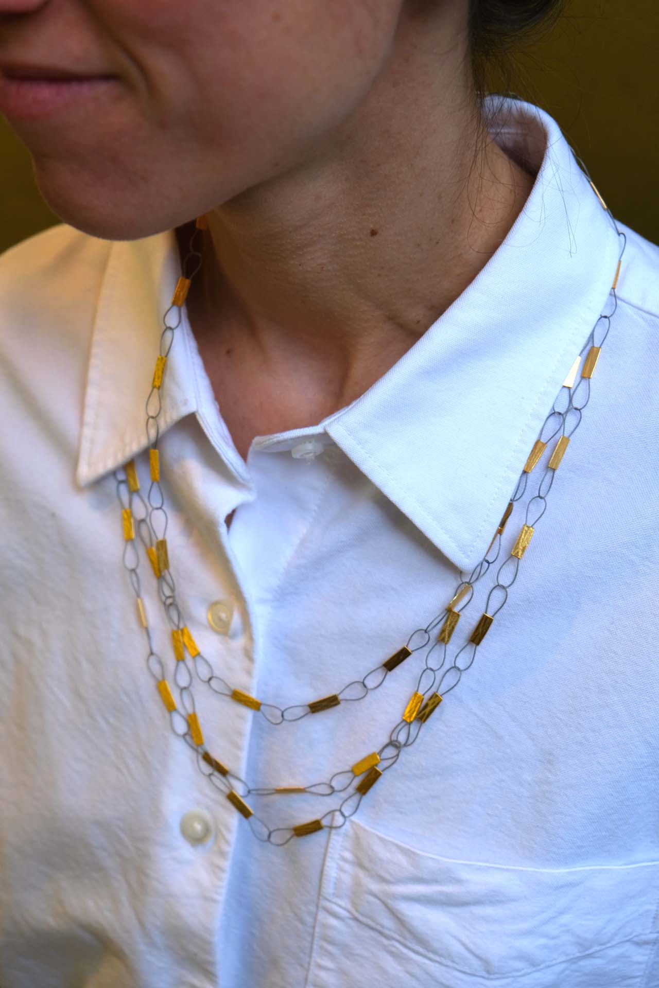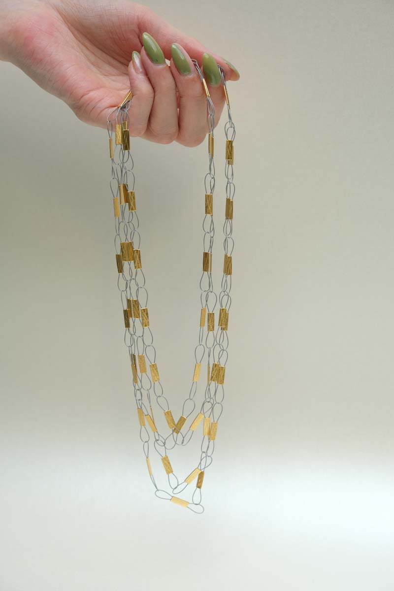 Tubes en vermeil enfilés sur du câble d’acier. Se porte en le doublant ou en le triplant.