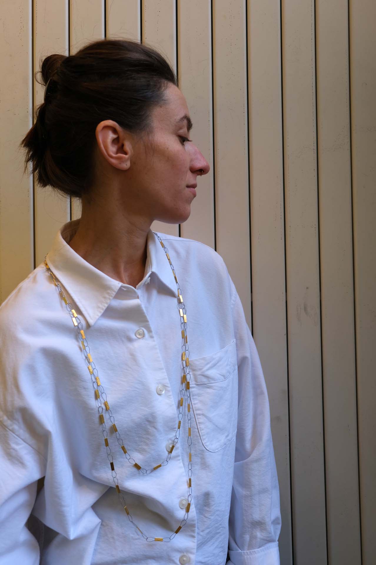 Légèreté et fluidité, c’est ce qu’évoquent ces bijoux. Elle a su trouver, dans la technique de l’électroformage, un langage sobre et minimaliste qui fait son intemporalité. Au plus près du corps, des petites touches de lumière virevoltent.