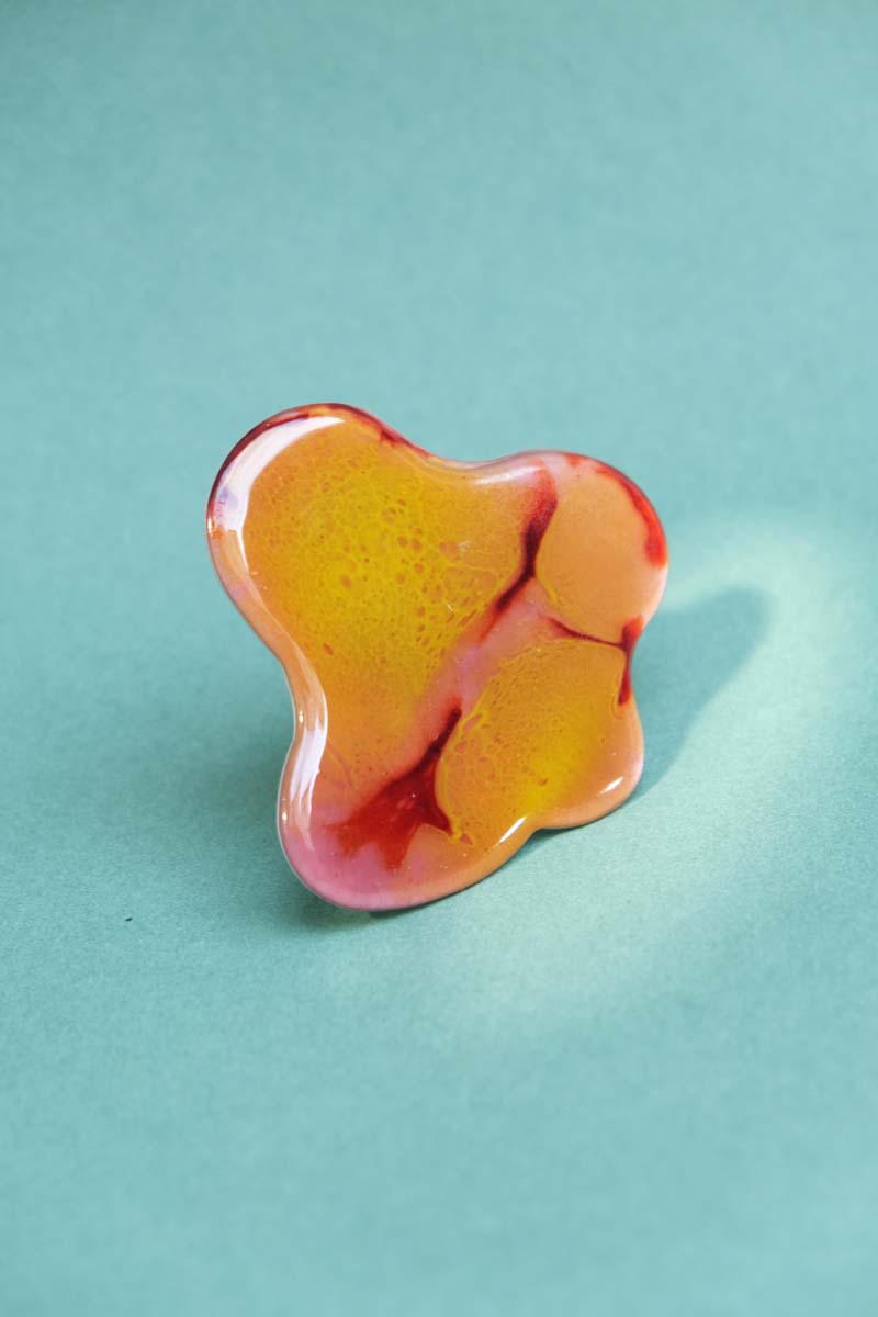 S’inspirant de photos aériennes, l’artiste bruxelloise Nevin Arig crée des formes abstraites qui invitent au calme. Elle travaille ici la résine et les pigments pour révéler des nuances délicates et des détails subtils. Cette broche légère reflète sa quête de simplicité, de beauté cachée et de douceur silencieuse.